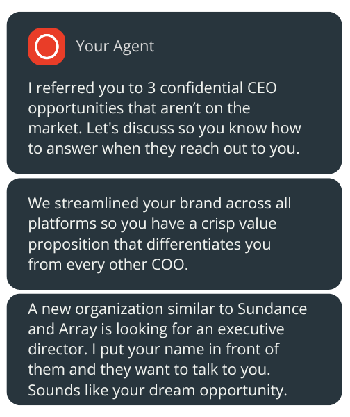 We are talent agents for professionals. Your team is powered by executive search experts with an expansive network of corporate partners, VCs, and non-profit organization. Athletes aren’t the only talent that need agents.